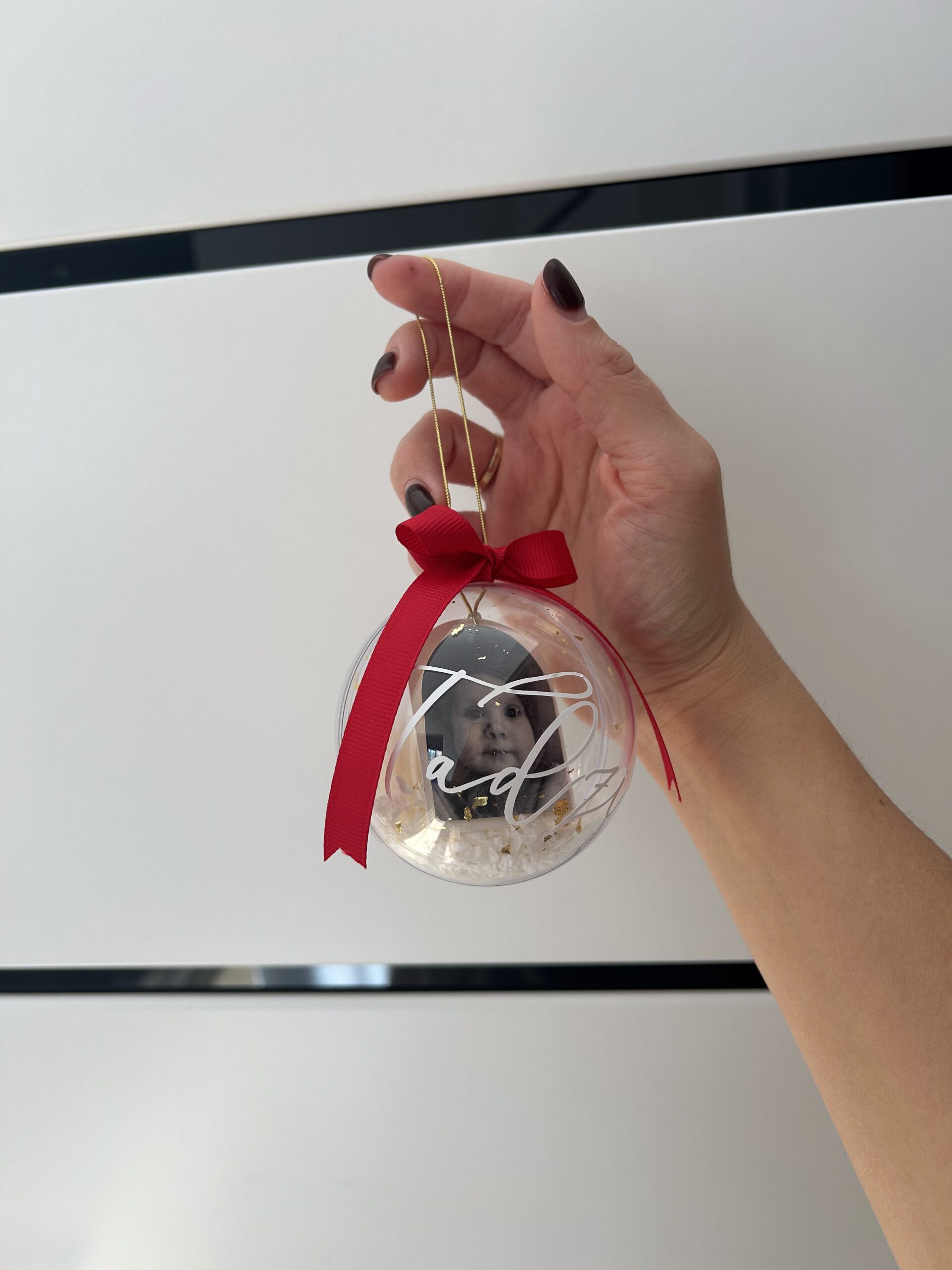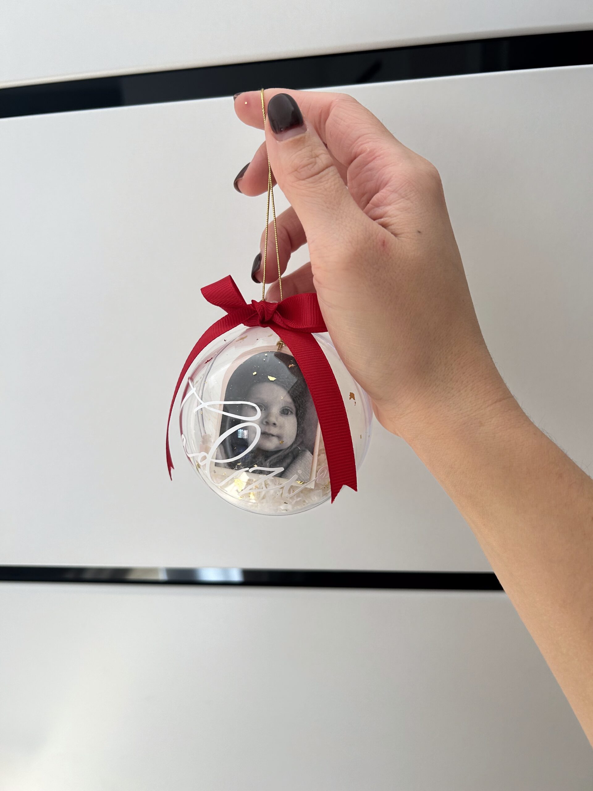 Personalizowana bombka akrylowa o średnicy 8 cm z wypełnieniem oraz kokardą