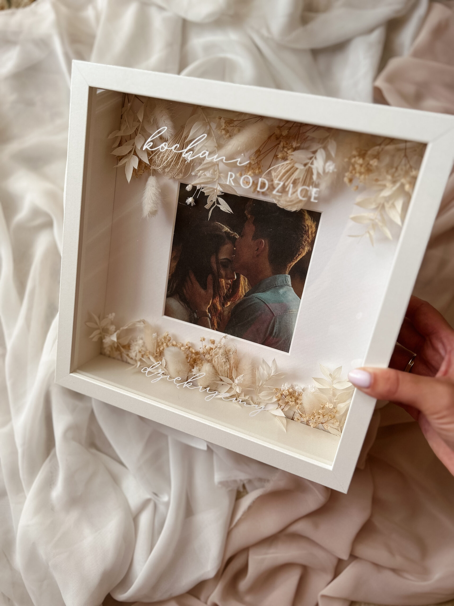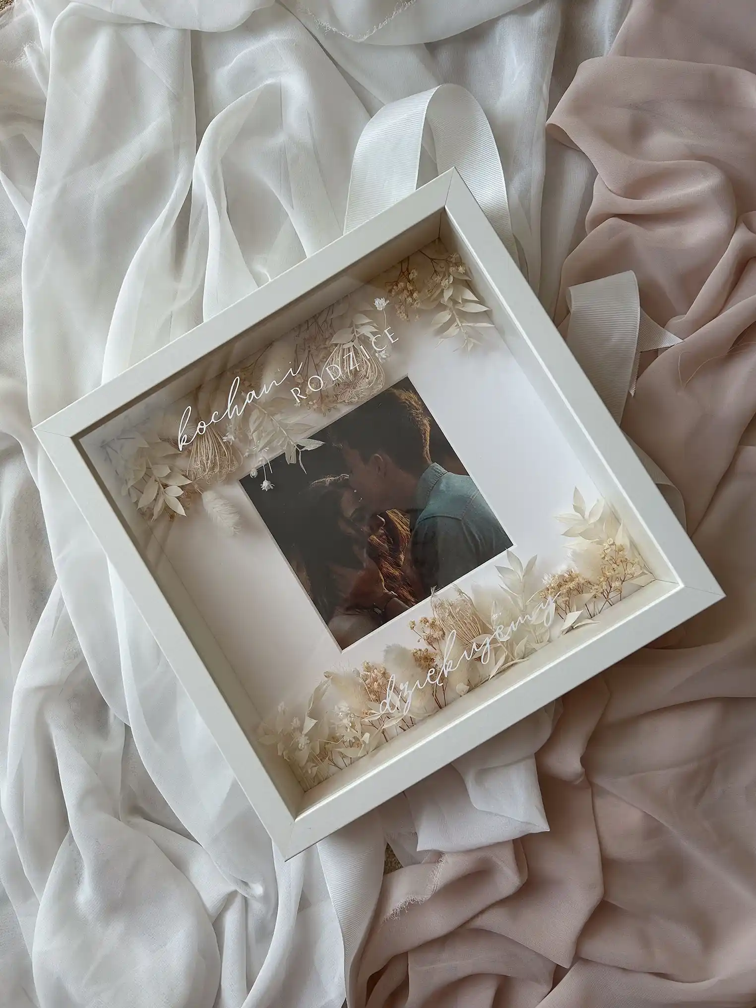 Ramka 25cmx25cm ze zdjęciem, dedykacją oraz dekoracją z suszonych kwiatów oraz traw