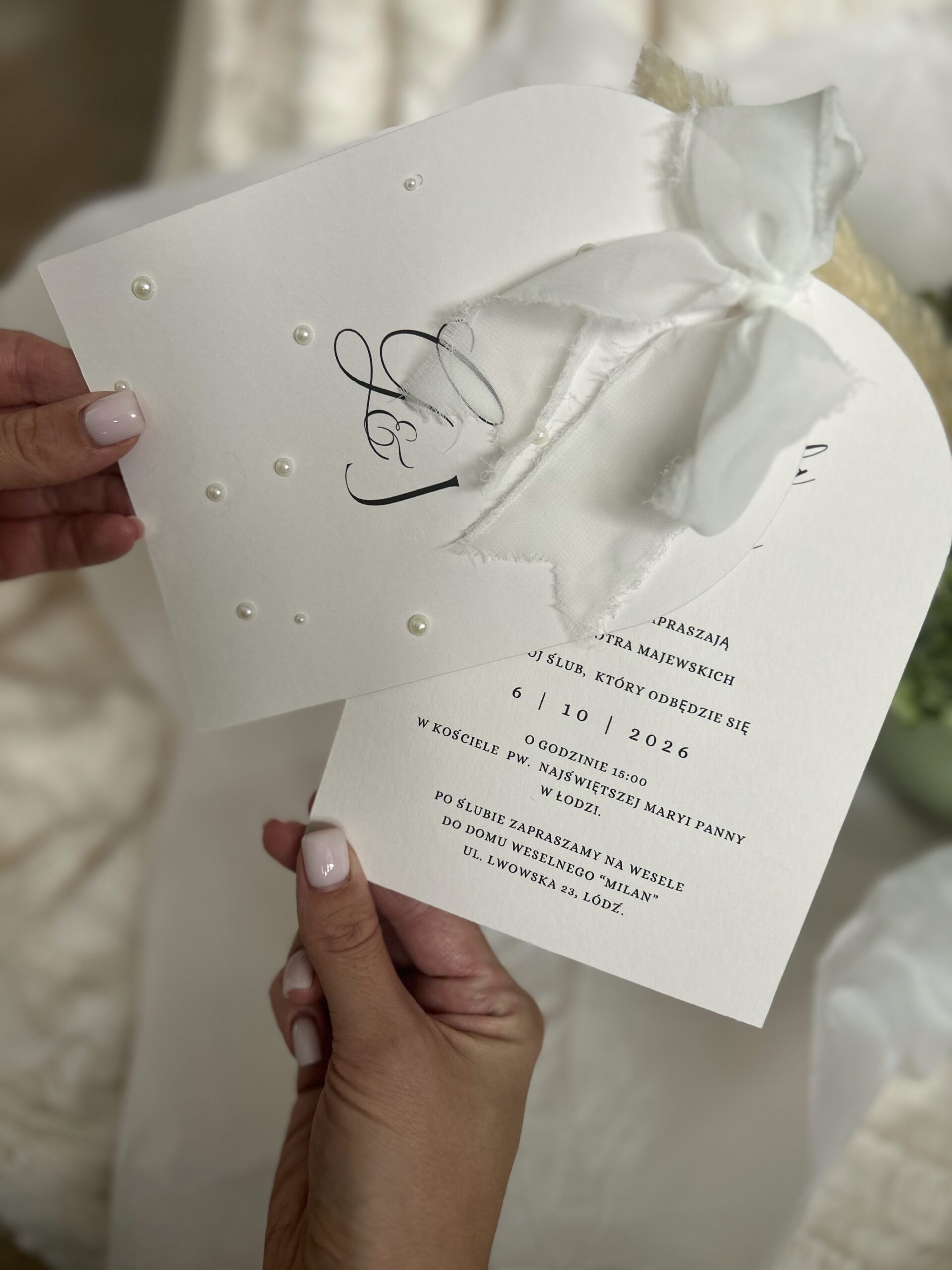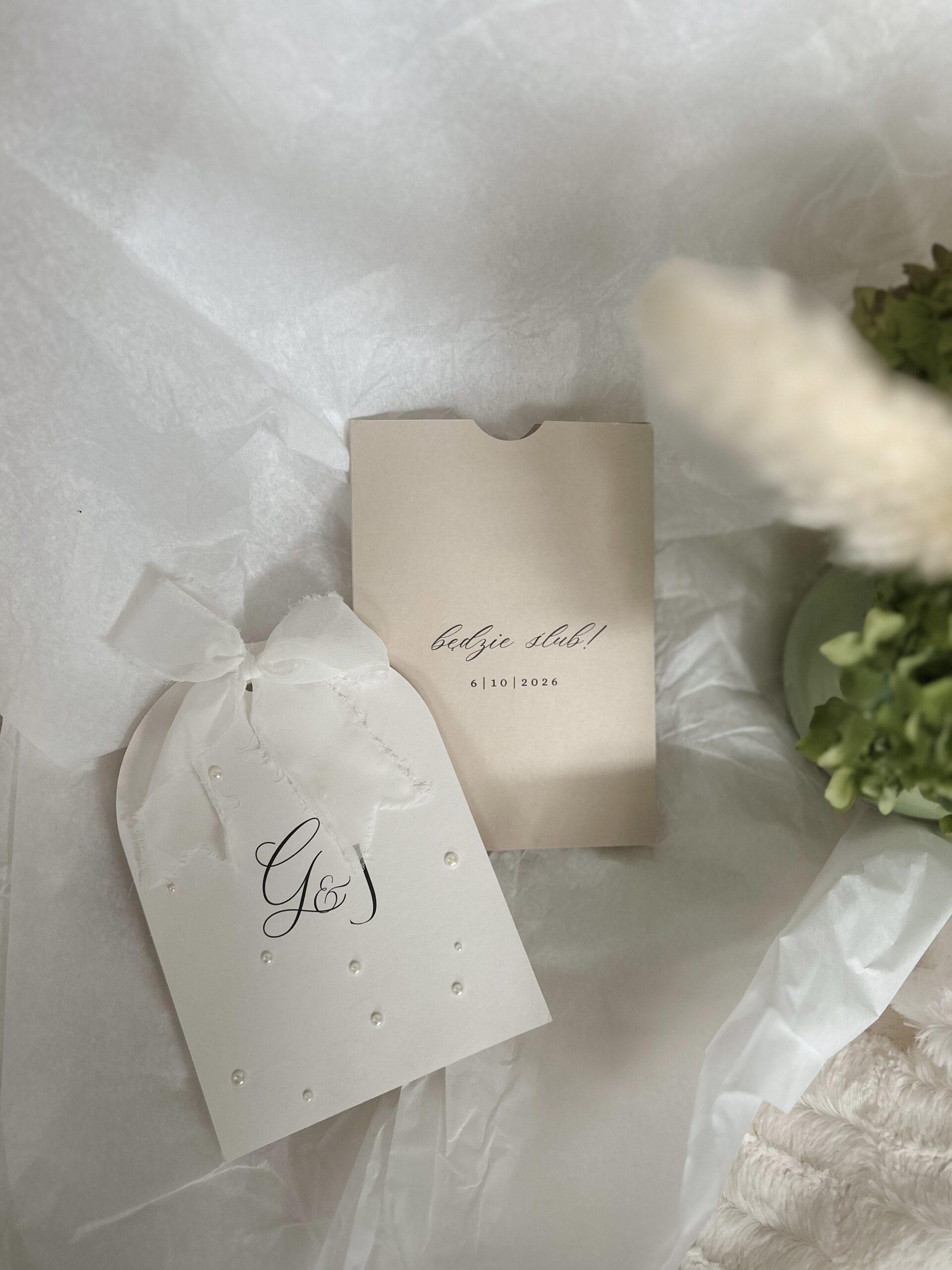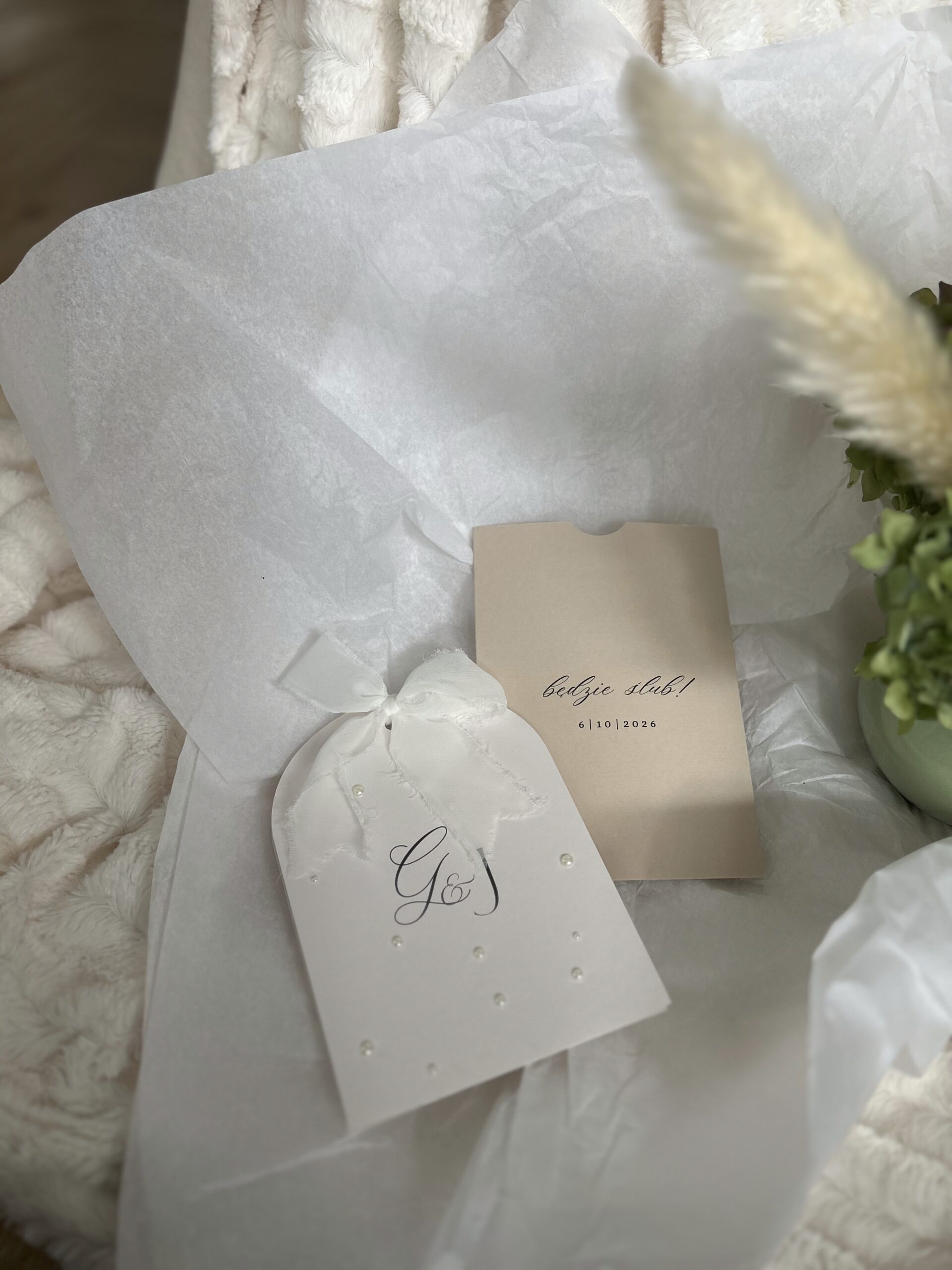 koperty kieszonkowej z inicjałami bądź innym tekstem oraz dwóch kart zaproszenia połączonych szarpaną wstążką. Całość dopełniają eleganckie perełki.